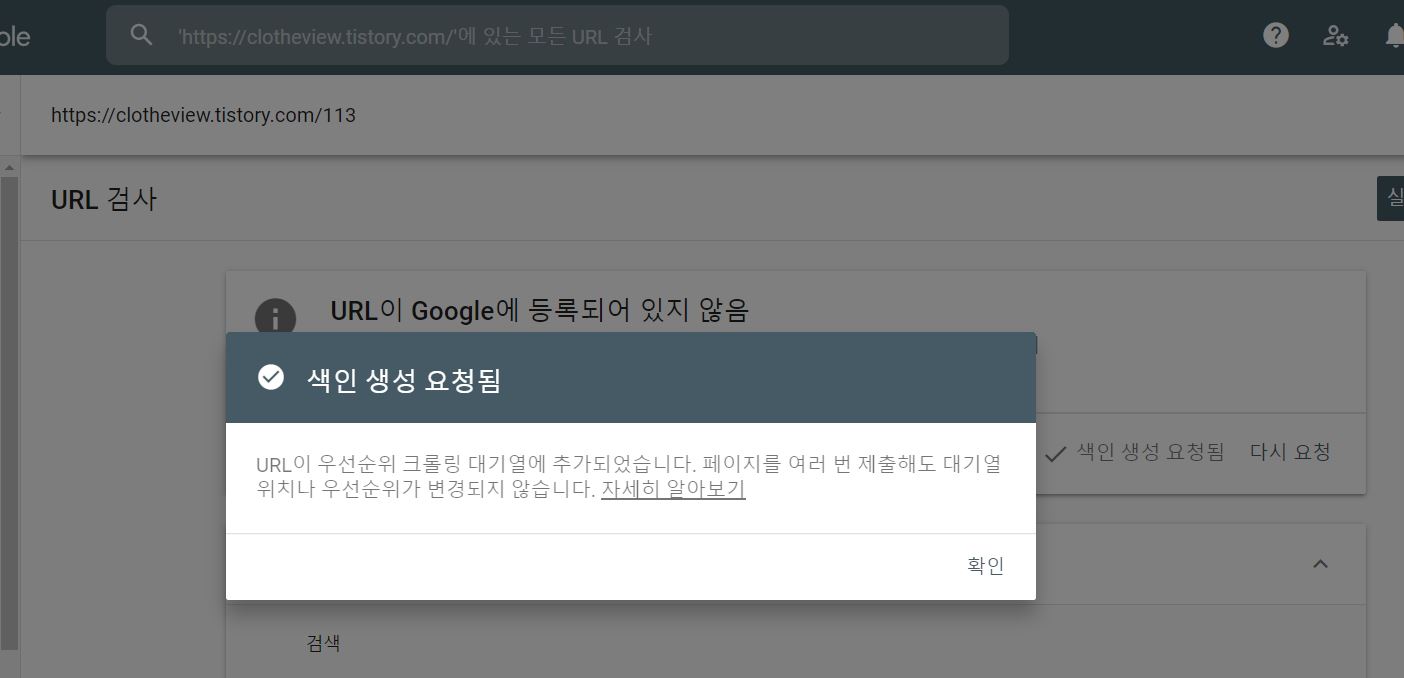색인 요청을 누르고 잠시 기다리면 '색인 생성 요청됨'이라는 창이 뜨는데 조회가 되지 않던 티스토리 글이 크롤링 대기열에 추가되었다는 내용이고 바로 적용되지 않고 2~3일 정도 소요 기간이 있기 때문에 기다려 주시면 됩니다.