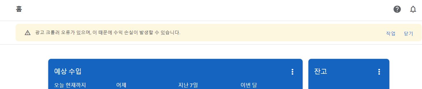 광고 크롤러 오류가 있으며, 이 때문에 수익 손실 이 발생할 수 있습니다.라는 문구가 어느샌가 없어지고 깔끔해졌는데 먼가 빨간 알림 창이 없어지니까 마음이 편안한 것 같은 느낌이 드는 것 같았습니다.