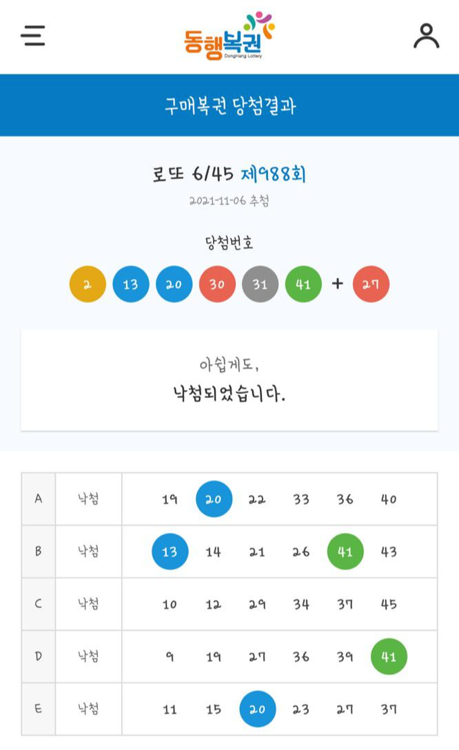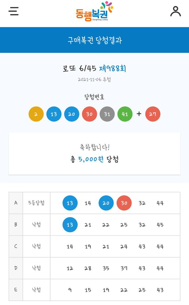 하나는 낙첨, 하나는 5등 당첨됬습니다.