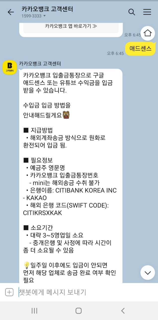 가장 정확한 카카오뱅크 은행 이름 SWIFT 식별코드 확인하는 방법은 간단합니다. 먼저 카카오 앱을 들어가서 검색으로 카카오뱅크 고객센터를 먼저 추가해주시고 대화창에 애드센스를 적어서 확인 버튼을 눌러주면 자동으로 답변이 오는데 이름과 식별코드가 바로 나오기 때문에 여기 적힌 대로만 적어주면 구글 애드센스 카카오뱅크 지급 등록을 할 수 있습니다.