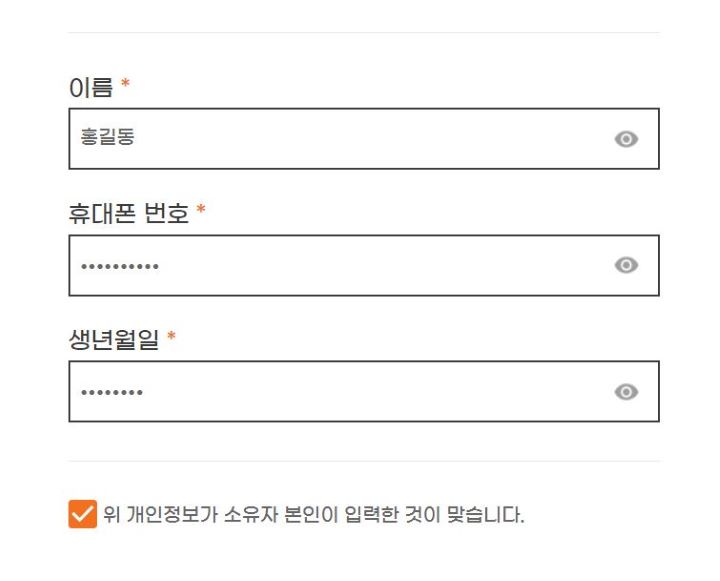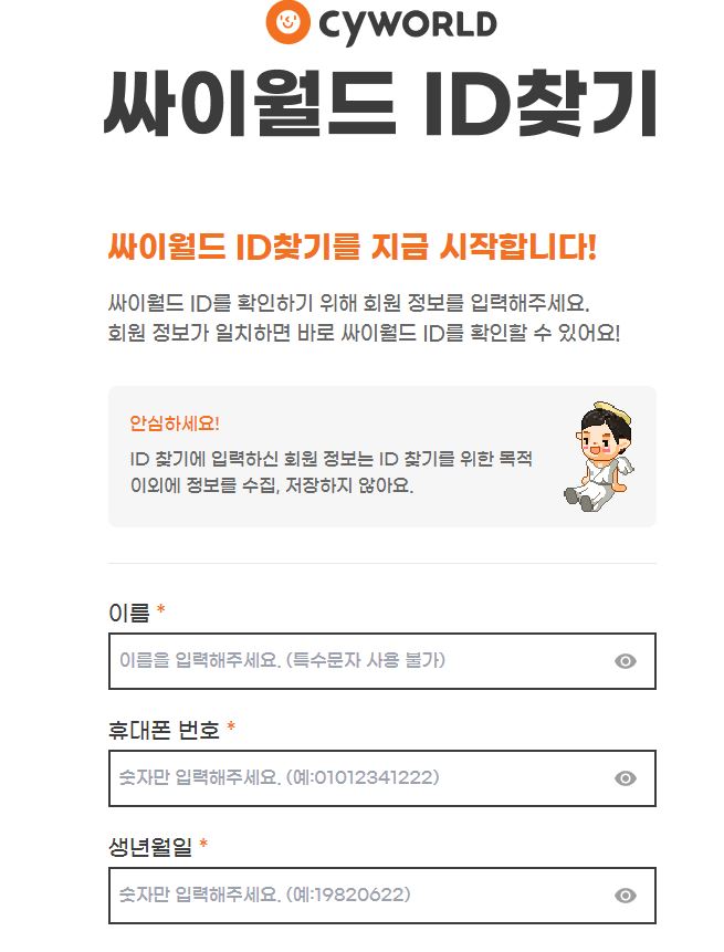 싸이월드 아이디 비밀번호 찾으려고 회원정보를 입력하는데 정보가 점으로만 표기되어 나오는데 처음에는 보안으로 이름까지 점으로 되어있어서 불편하다고 생각했는데 똑바로 입력이 되었는지 확인을 하고 싶다면 옆쪽에 있는 눈 모양 표시를 클릭하면 내가 입력한 정보를 확인할 수 있었습니다.