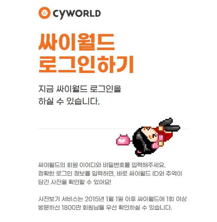 싸이월드 로그인으로 추억이 담긴 사진들을 확인할 수 있는데 그러기 위해서는 2015년 1월 1일 이후 싸이월드에 1회 이상 방문하셨던 분들에게 우선적으로 확인이 가능하다고 하는데 저도 얼마 만에 들어갔는지 정확하게 기억이 나지 않아서 혹시 들어가 질까 싶어서 싸이월드 로그인해보려고 했습니다.