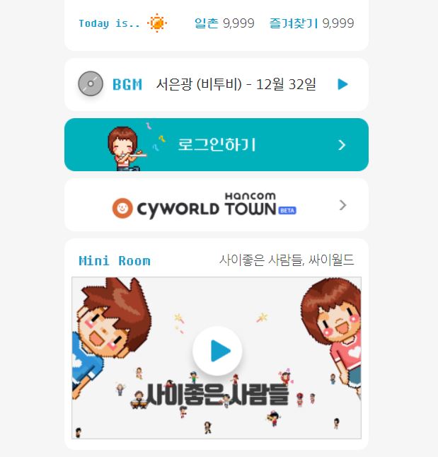 싸이월드 제일 먼저 들어가면 이렇게 나오는데 옛날 감성 미니홈피가 생각이 났었던 것 같고 그때 재미있게 이용했었는데 하는 기억도 들었던 것 같습니다. 주변 지인분들도 싸이월드 다시 들어가 보고 싶다는 이야기를 했었는데 싸이월드 서비스 재개를 선언했었지만 오픈 예정일이 계속 연기가 돼서 이용하지 못했던 게 아쉬워서 이번에 싸이월드 로그인을 해보려고 합니다.