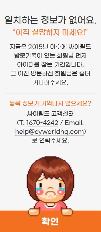 일치하는 정보가 없어요. "아직 실망하지 마세요" 보자마자 벌써 실망을 해버렸던 것 같습니다. 싸이월드 로그인 안 한 지 그렇게 오래됬었나 싶기도 했었는데 어쩔 수 없지라는 생각이 들었고 이름을 개명하신 분들이나 휴대폰 번호변경으로 정보를 확인할 수 없는 분들도 있을 텐데 현재까지는 기존 정보를 입력했음에도 싸이월드 로그인이 되지 않는 분들은 고객센터를 통해서 정보를 확인해 보시는 게 좋을 것 같고 정식 출시 이후에 싸이월드 로그인 할 수 있을 것 같습니다.