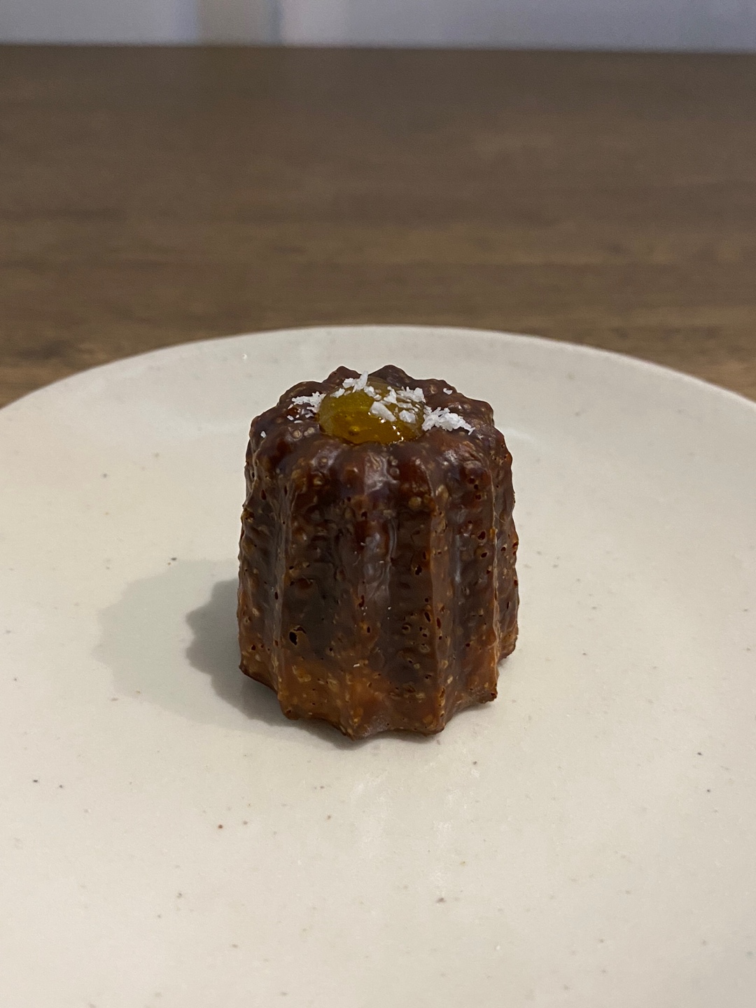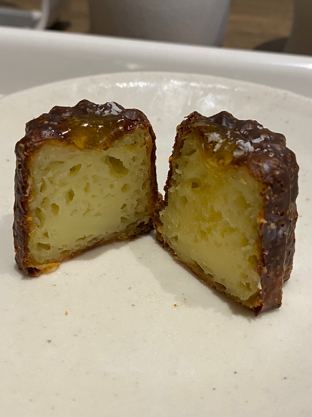 까눌레는 바닐라빈, 솔티카라멜, 발로나초코, 망고코코넛, 얼그레이, 제주말차 이렇게 6가지 맛이 있는데 그중에서 유일하게 남은 망고코코넛 반을 갈라서 사진을 찍고 먹어봤습니다.