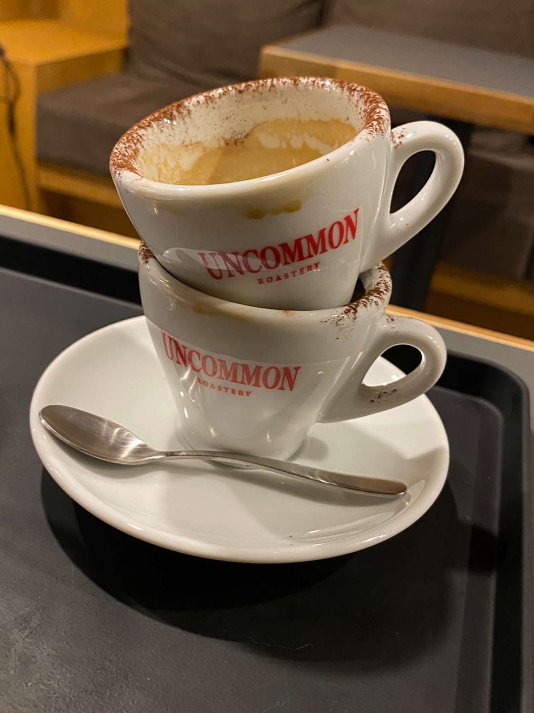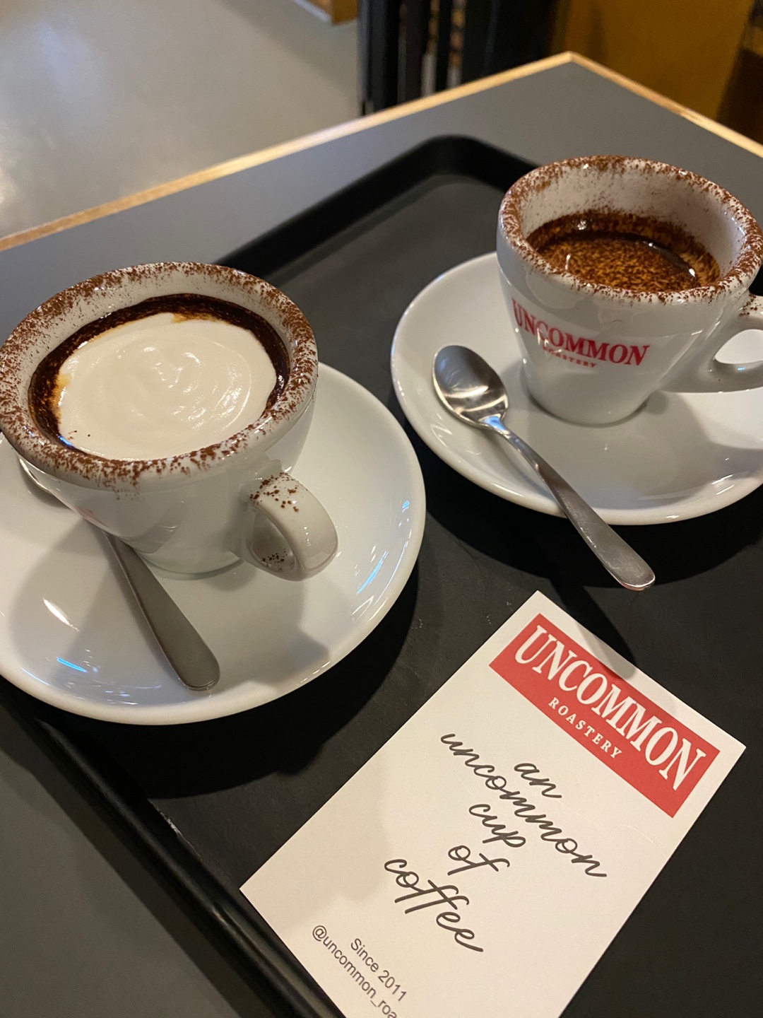 언커먼로스터리 다양한 에스프레소 종류가 있었는데 평소에 좋아하는 스트라바짜토 그리고 피에노를 주문했습니다. 원두자체가 산미가 조금 있는 편이었는데 먹기 부담스러운 정도는 아니었고 맛있었습니다.