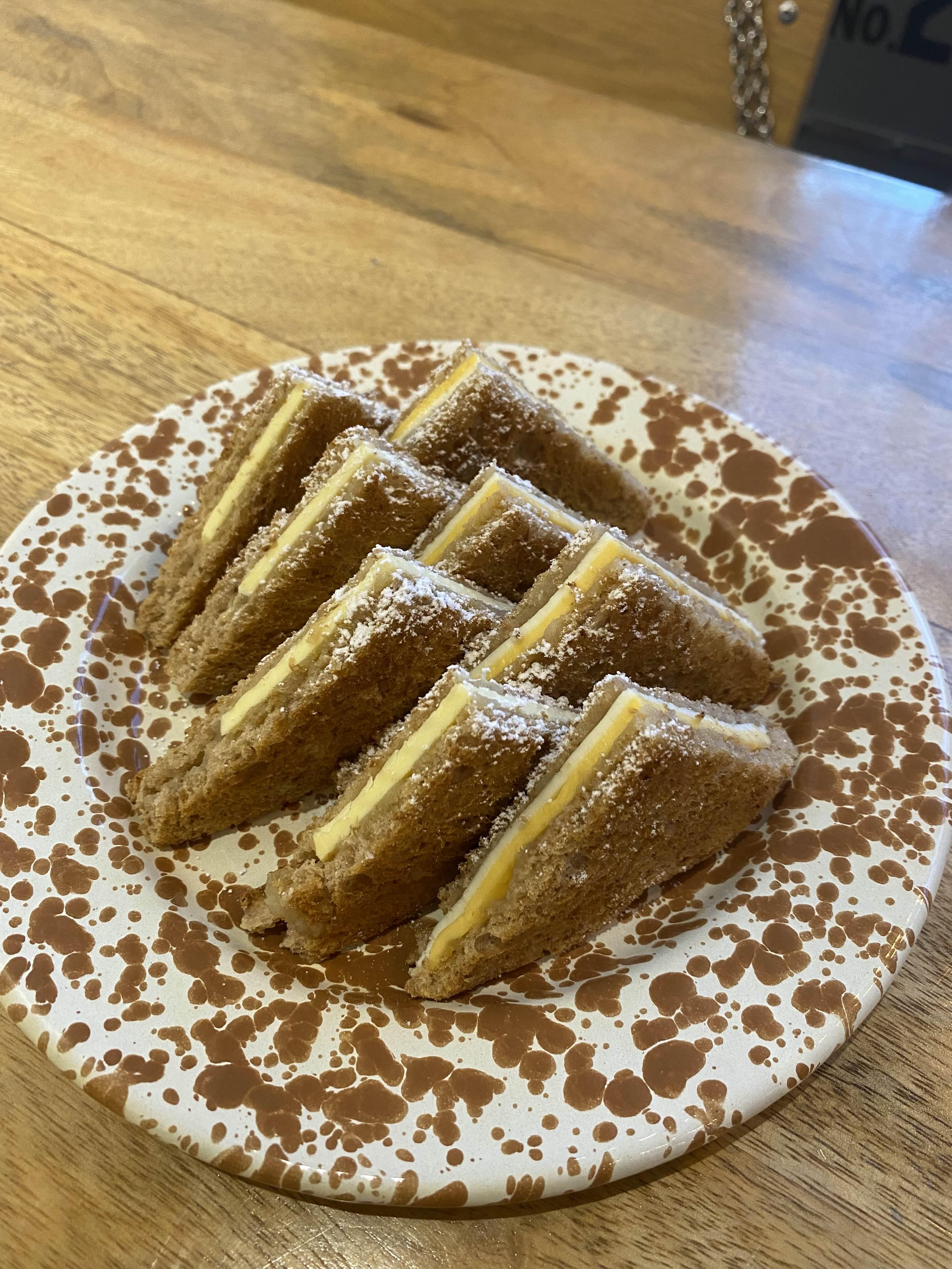 카야토스트는 버터, 치즈 이렇게 고를 수 있는데 반반도 가능해서 저는 반반으로 골랐었습니다. 카야토스트는 간단한 메뉴지만 만드는 곳마다 확실하게 차이가 나는데 경산 옥산동 카페 바이버리커피 카야토스트는 얇고 겉은 바삭한 식감이 특징이고 안에 버터, 치즈 조합이 잘 어울려서 먹기 좋았습니다. 맛자체가 특별하게 느껴지진 않았지만 아메리카노와 함께 먹기에 괜찮았습니다.