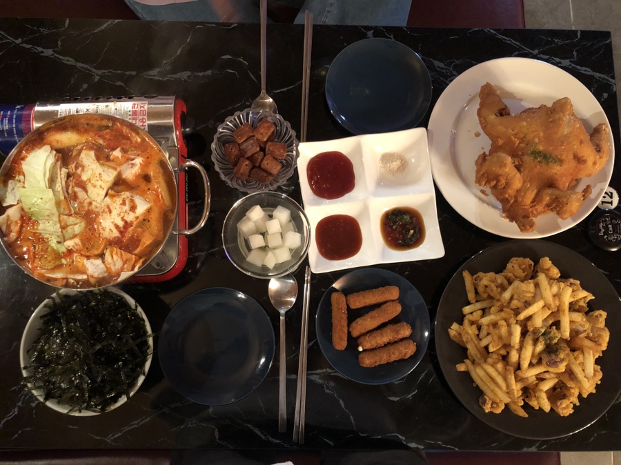 똥집튀김, 국물떡볶이, 감자튀김, 볶음밥